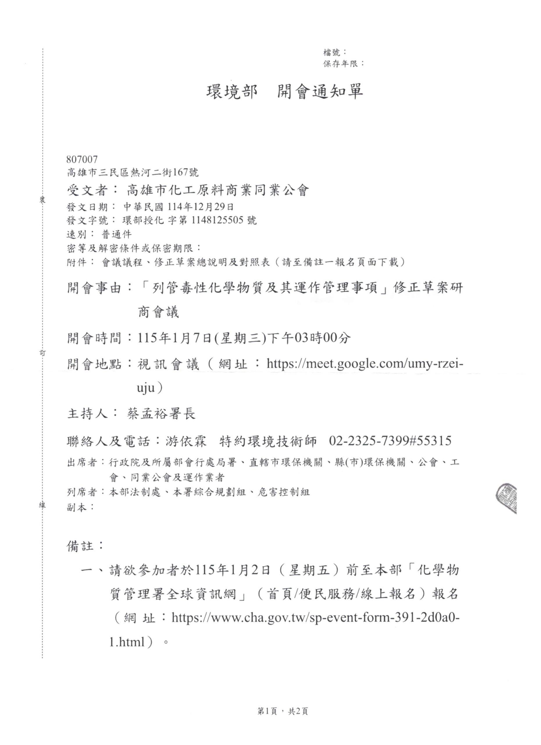 環境部來函,舉行「列管毒性化學物質及其運作管理事項」修正草案研商會議 採用視訊會議舉行,請有從事毒化物的廠商會員, 踴躍報名參與