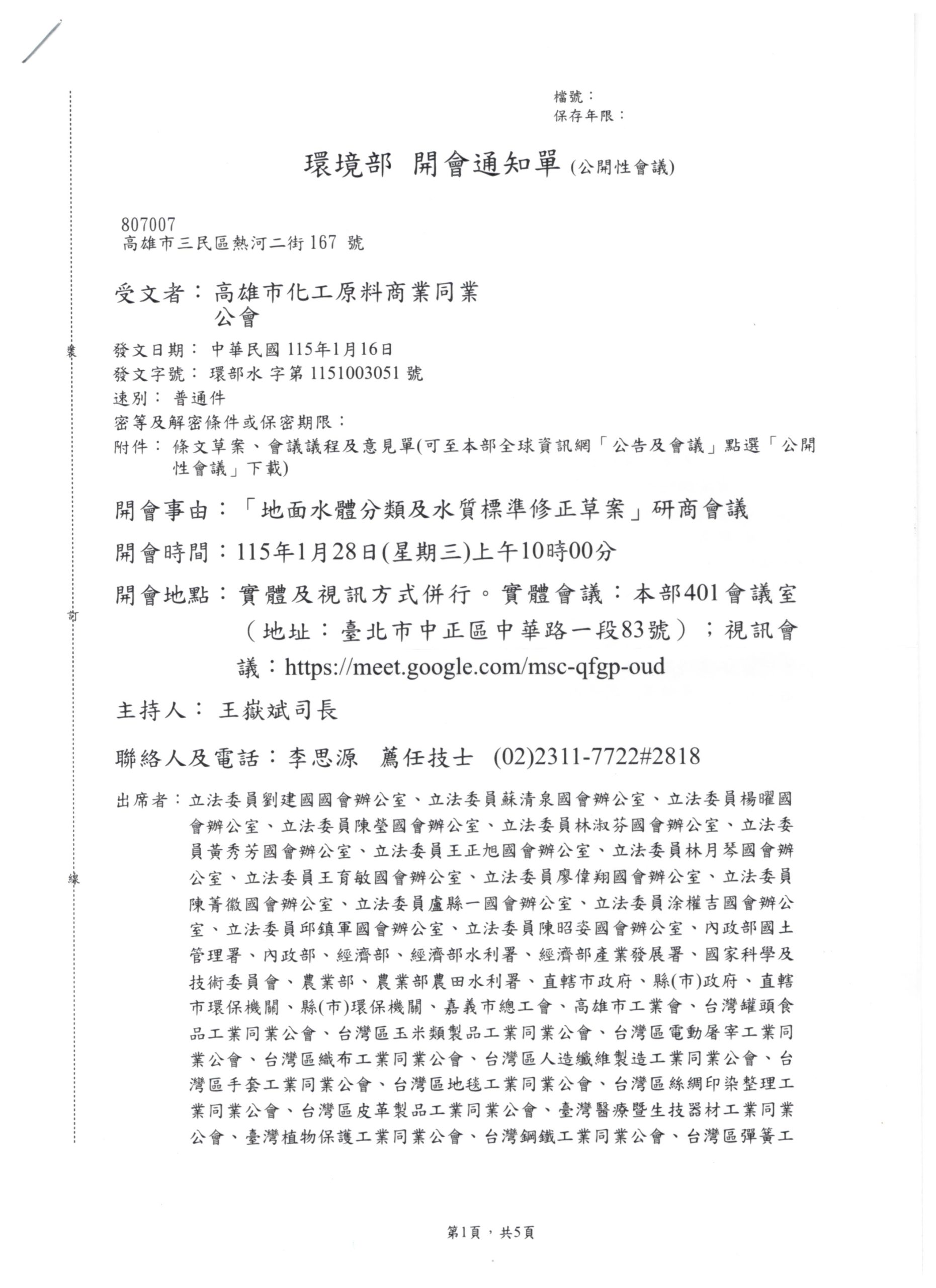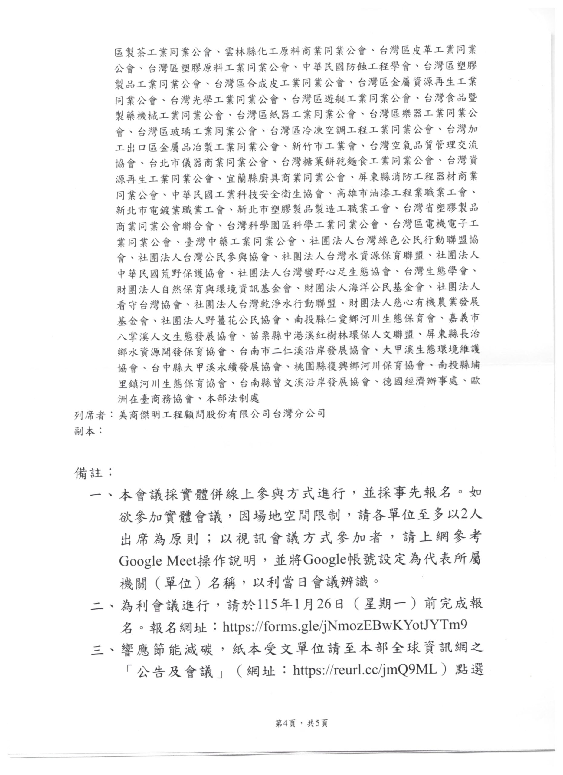- 環境部來函,舉行「地面水體分類及水質標準修正草案」研商會議. 有意參與者會員, 請詳見以下報名資訊2026 年 1 月 20 日